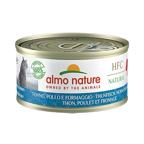 Almo Nature HFC Tuna, Chicken & Cheese apvieno divus augstvērtīgus olbaltumvielu avotus – tunci un vistu – ar nelielu siera piedevu gardumam. Barība pagatavota no HFC sastāvdaļām, kas sākotnēji bija piemērotas cilvēku pārtikai, nodrošinot maksimālu uzturvērtību un drošību jūsu kaķim.