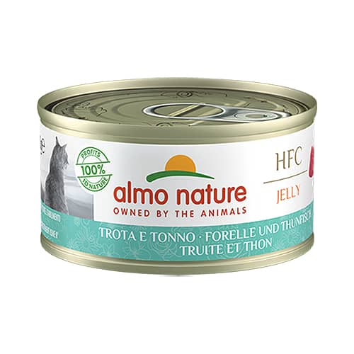 Almo Nature HFC Jelly Trout & Tuna ir dabīga un pilnvērtīga barība kaķiem, kas izgatavota no 100% HFC sastāvdaļām – cilvēku uzturam piemērotām zivīm. Šie konservi apvieno sulīgus foreles un tunča gabaliņus vieglā želejā, nodrošinot izcilu garšu, augstu uzturvērtību un lielisku sagremojamību.