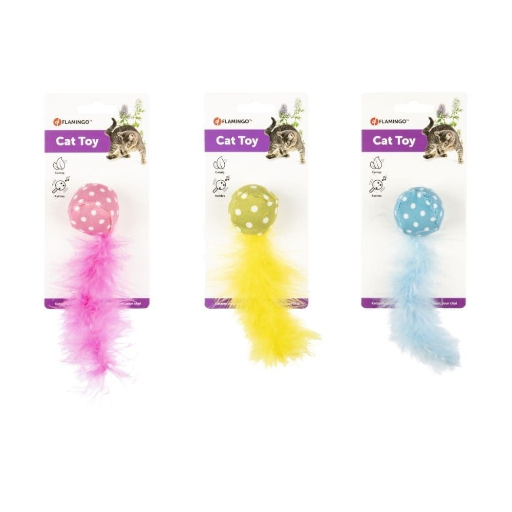 Flamingo CAT rotaļlieta – bumba ar skaņu un spalvām ir ideāla izvēle, lai iedvesmotu kaķi kustībai, rotaļām un medību instinktu attīstīšanai.