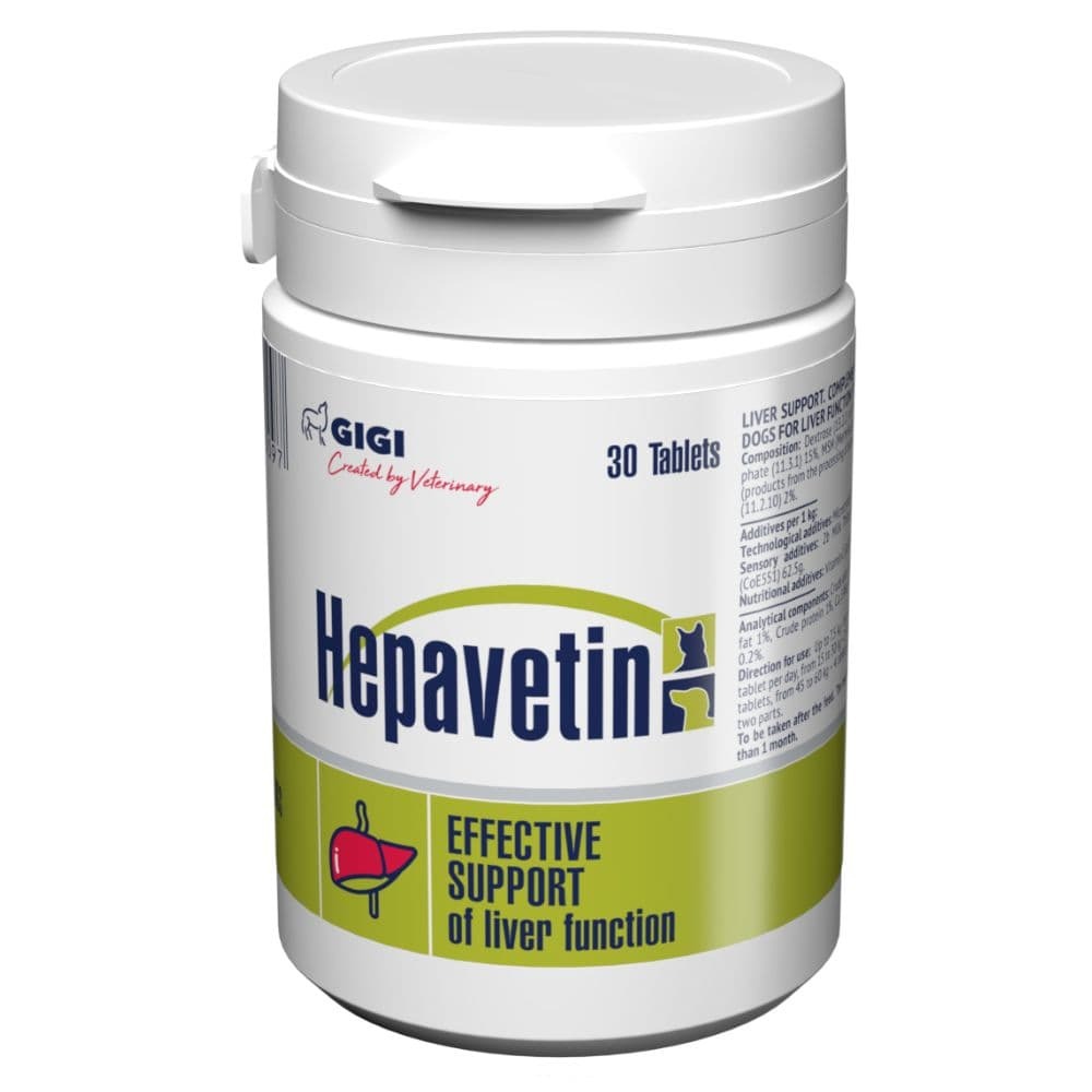 GIGI Hepavetin N30 ir papildbarība suņiem un kaķiem, kas īpaši izstrādāta aknu funkcijas stiprināšanai, šūnu atjaunošanai un vielmaiņas līdzsvarošanai.
