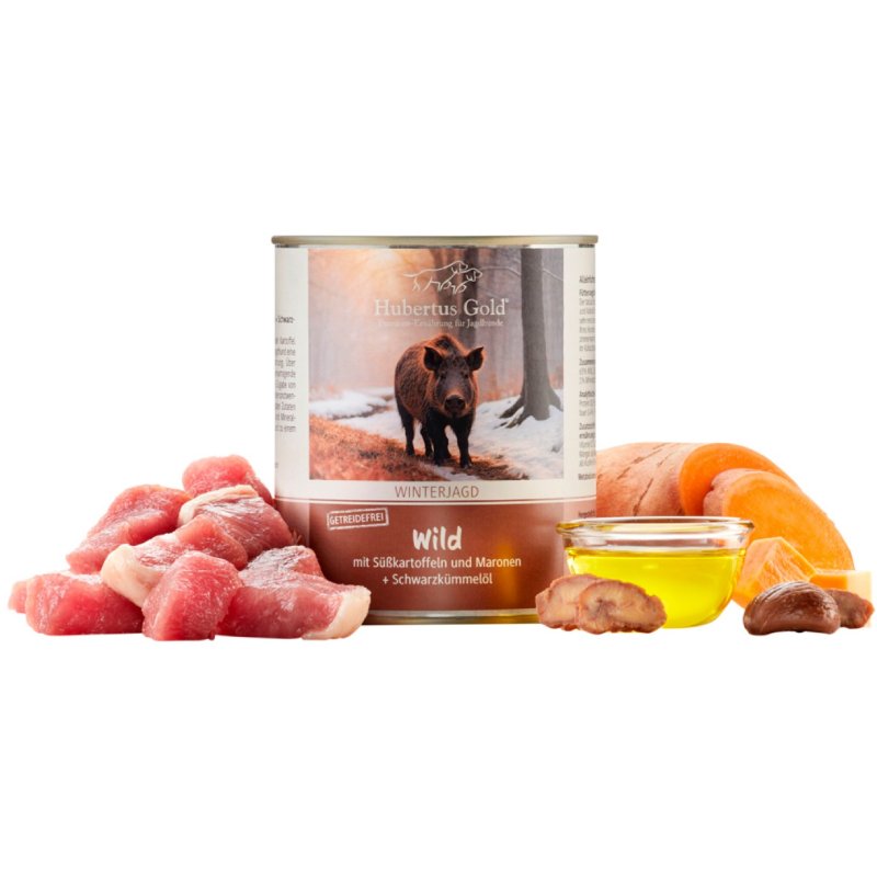 HUBERTUS GOLD Winter Hunt 2025 ir pilnvērtīgi konservi ar 63% medījuma gaļas, kas papildināti ar saldajiem kartupeļiem, kastaņiem un melnās ķimenes eļļu, nodrošinot vieglu sagremojamību, veselīgu ādu un spīdīgu apmatojumu.
