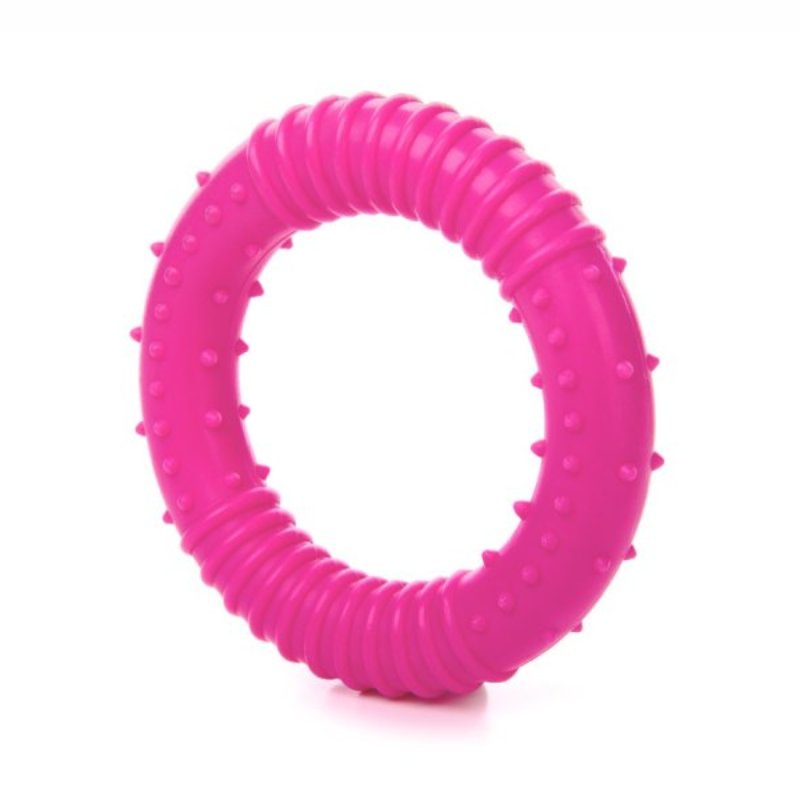 JK TPR Gredzens Pink ir droša un elastīga rotaļlieta maziem suņiem un kucēniem, kas palīdz uzturēt gan zobu higiēnu, gan aktīvu dzīvesveidu.