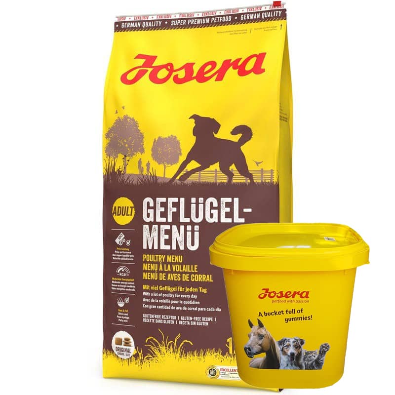 JOSERA POULTRY MENU ir Super Premium klases barība pieaugušiem suņiem ar normālu aktivitātes līmeni un jutīgu gremošanas sistēmu. Tā ir izstrādāta, lai nodrošinātu optimālu uzturvielu uzsūkšanos, lielisku garšu un gremošanas komfortu, pateicoties augstam mājputnu proteīna un rīsu saturam.