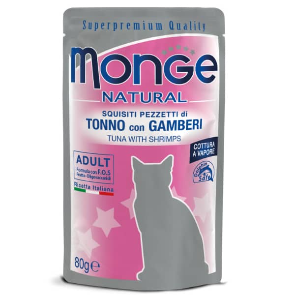 MONGE CAT NATURAL POUCHES TUNA konservi kaķiem Tuncis, garneles 80g