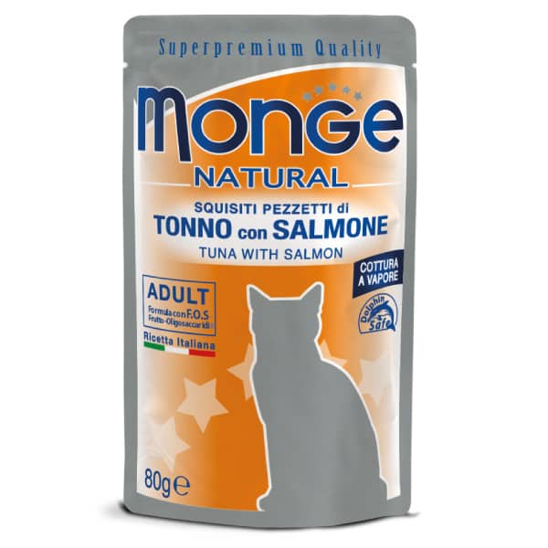 Izvēlies Monge Cat Natural Tuna & Salmon konservus 80g – gardu recepti ar proteīniem, Omega-3 un FOS. Pasūti Zoopasaule.lv un sagādā savam kaķim izsmalcinātu maltīti!