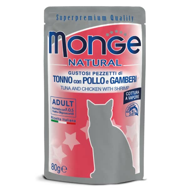Izvēlies Monge Cat Natural Tuna, Chicken & Shrimps konservus 80g – augstvērtīgu uzturu ar Omega-3, FOS un izcilu garšu. Pieejams Zoopasaule.lv ar ātru piegādi!