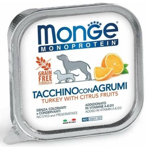 Pilnvērtīga un sabalansēta mitrā barība suņiem – izcila izvēle jutīgiem un izvēlīgiem mājdzīvniekiem. MONGE Monoprotein Fruits līnija piedāvā vienu dzīvnieku olbaltumvielu avotu – augstvērtīgu tītaru, papildinātu ar citrusaugļiem kā dabīgu vitamīnu un antioksidantu avotu. Piemērota suņiem ar pārtikas nepanesību vai nepieciešamību pēc monoproteīna uztura.