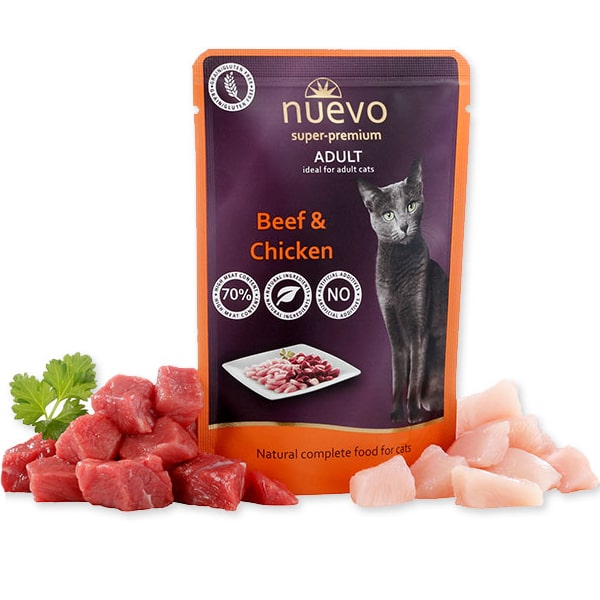 Pasūtiet NUEVO CAT ADULT konservus ar liellopa un vistas gaļu 85g Zoopasaule.lv un nodrošiniet savam kaķim pilnvērtīgu uzturu ar ātru piegādi visā Latvijā!