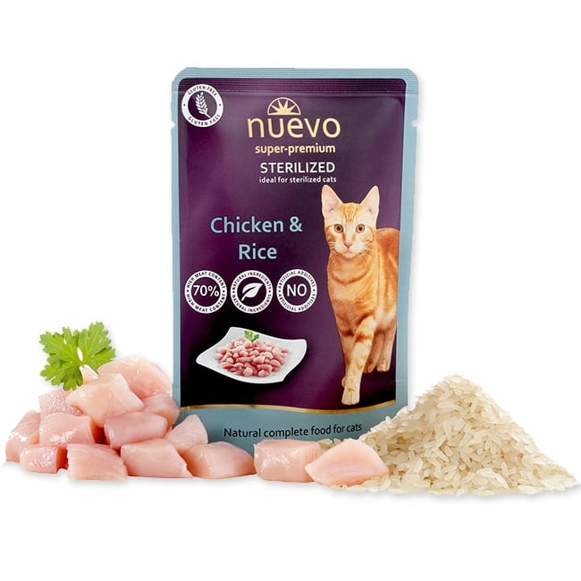 Pasūtiet NUEVO CAT STERILISED konservus ar vistu un rīsiem 85g Zoopasaule.lv un nodrošiniet savam sterilizētajam kaķim sabalansētu uzturu ar ātru piegādi visā Latvijā!