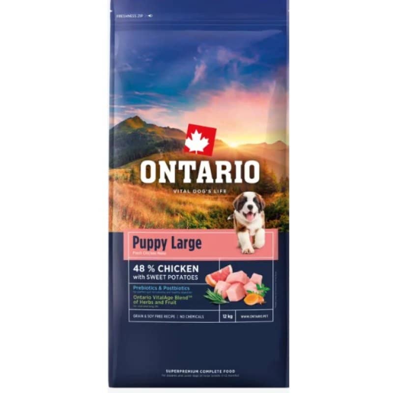 Pasūti ONTARIO DOG PUPPY JUNIOR LARGE CHICKEN & SWEET POTATO 12kg Zoopasaule.lv internetveikalā un nodrošini savam kucēnam profesionālu superpremium uzturu veselīgai augšanai ar ātru piegādi visā Latvijā.