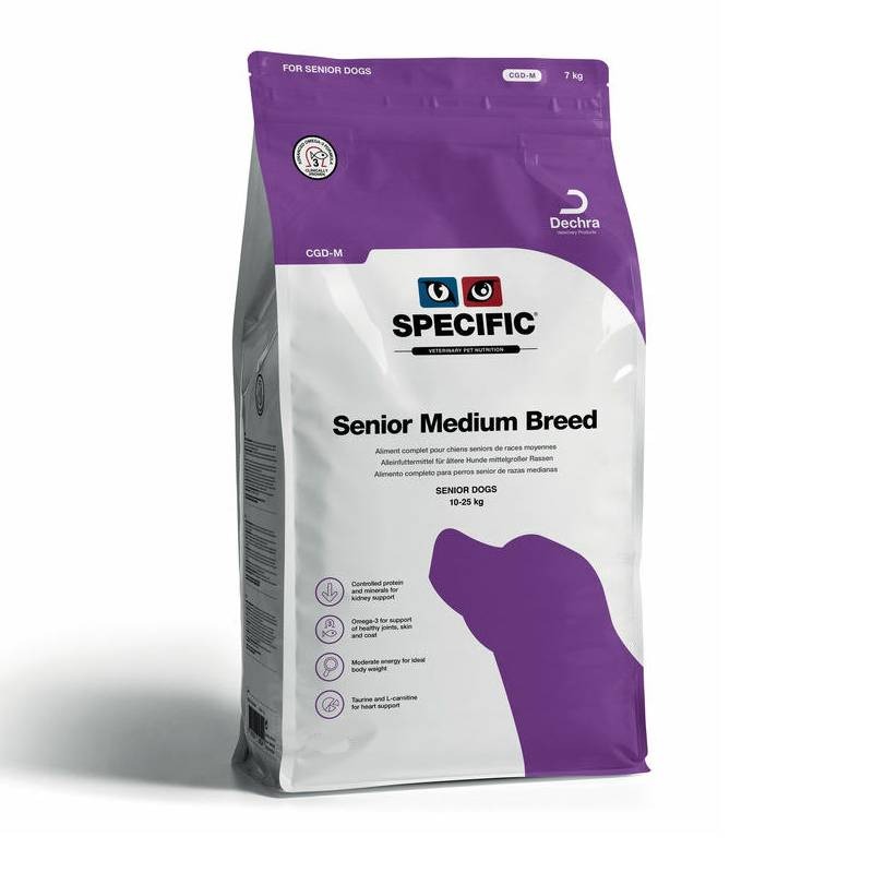 SPECIFIC CGD-M SENIOR MEDIUM BREED ir sabalansēta un pilnvērtīga sausā barība vidēja izmēra suņiem (10–25kg) no 8 gadu vecuma. Tā veicina nieru veselību, locītavu atbalstu un palīdz uzturēt ideālu svaru senioru suņiem.