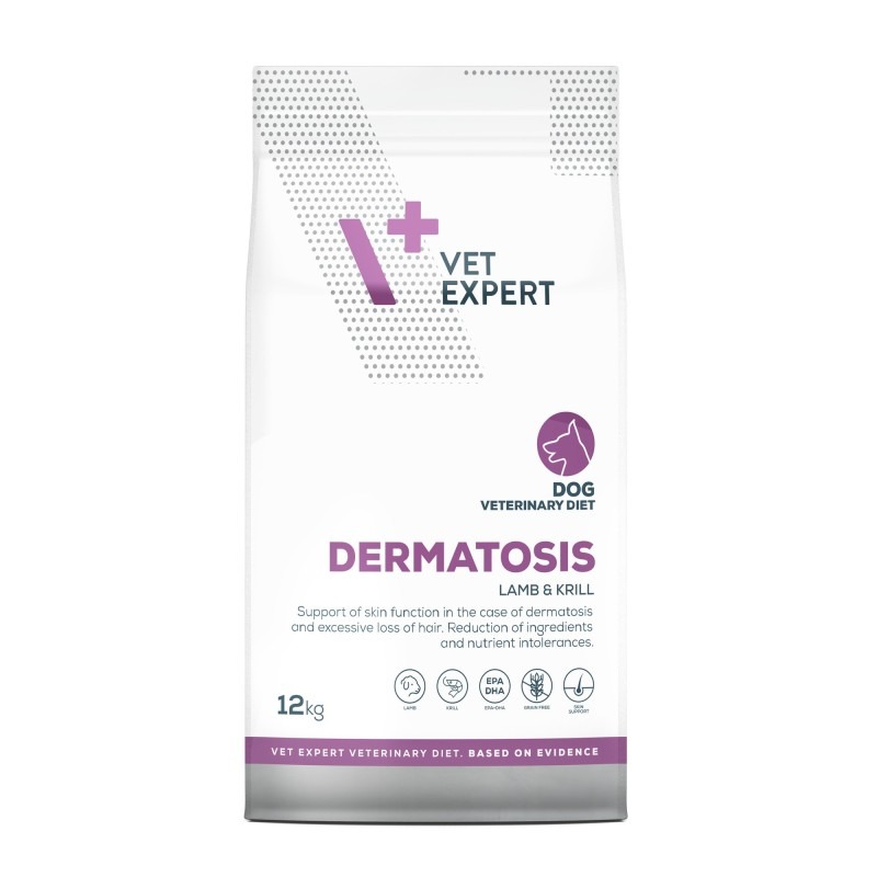 VETEXPERT VD DERMATOSIS LAMB & KRILL ir specializēta diētiskā barība pieaugušiem suņiem ar dermatoloģiskiem traucējumiem un barības vielu nepanesību. Tā palīdz atbalstīt ādas funkcijas dermatožu un matu izkrišanas gadījumos, kā arī izmantojama kā eliminācijas diēta pārtikas alerģijām un kuņģa-zarnu trakta reakcijām.